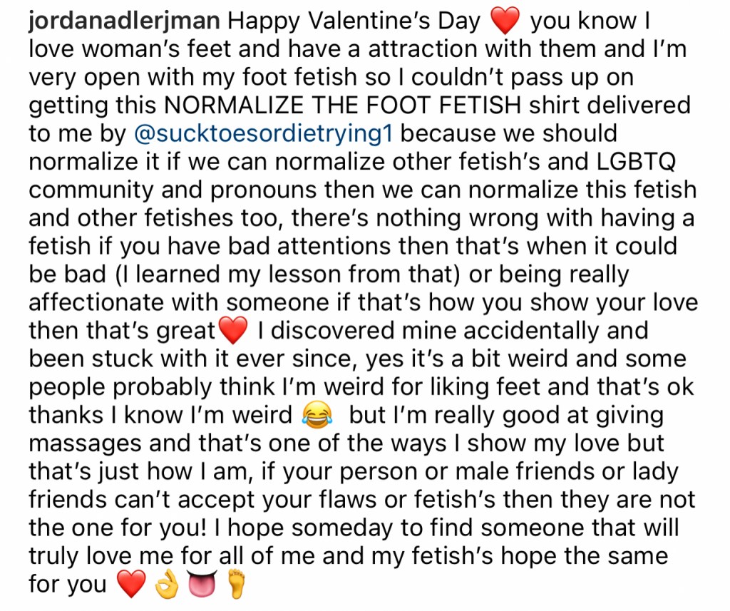 Jordan and his co-host interview foot model Missy Mimosa. In the episode’s description, he states that their goal is to “talk about her career as Foot Model and try to normalize the foot fetish community for others to learn more about and to understand!”
